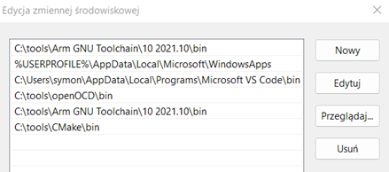 To simplify further usage, I will delete the path to Arm Toolchain (C:\tools\Arm GNU Toolchain\10 2021.10\bin) and create my own variable (ARMGCC_DIR):